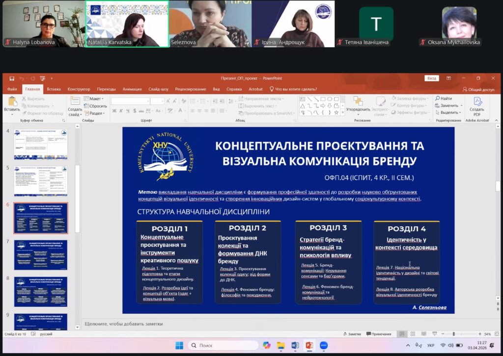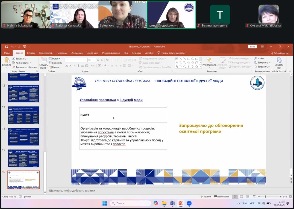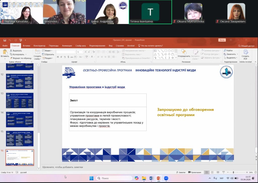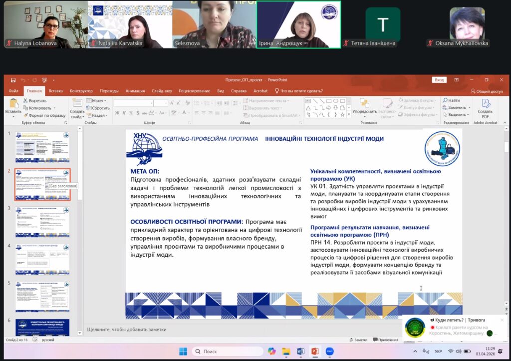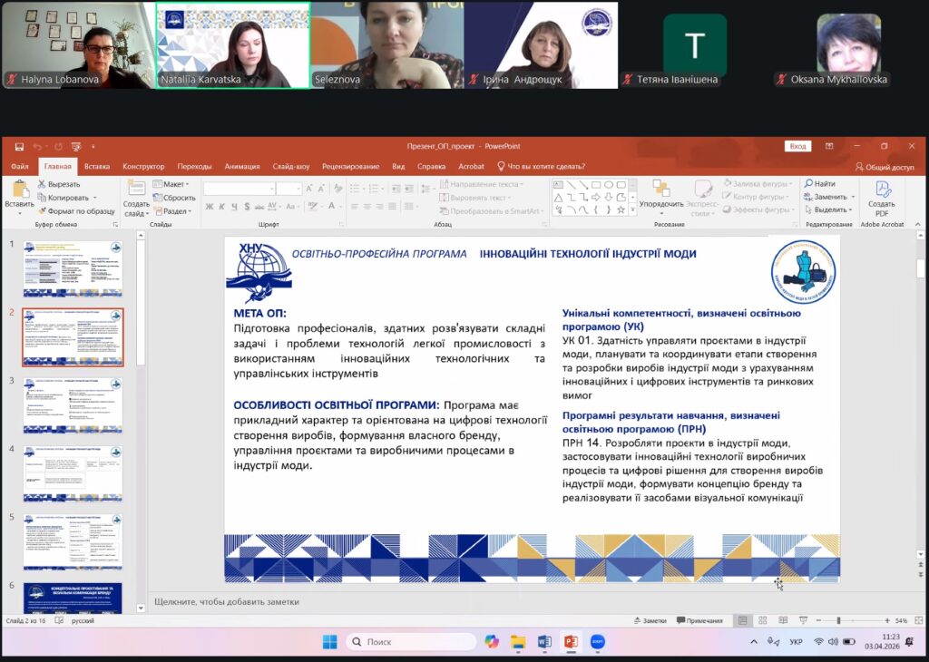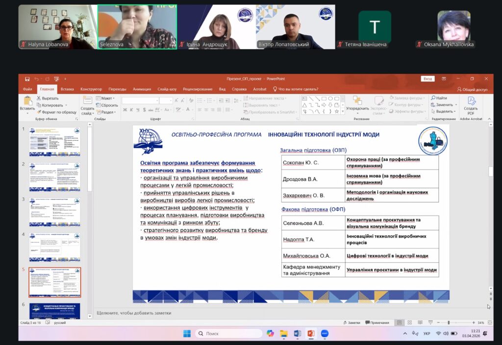 3 квітня 2026 року на кафедрі індустрії моди в легкій промисловості відбулося обговорення проєкту освітньої програми «Інноваційні технології в індустрії моди», розробленої для підготовки фахівців другого (магістерського) рівня вищої освіти за спеціальністю G15 «Технології легкої промисловості».